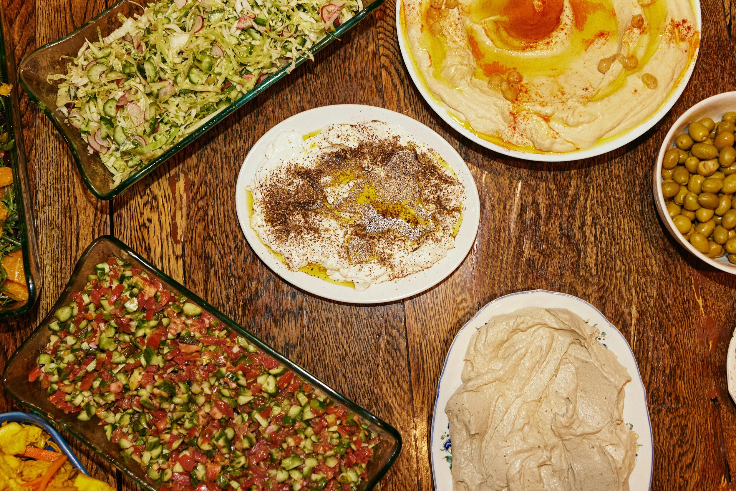 Grilled lamb and chicken, crispy falafel, lamb kibbeh, hummus, arab salad, home-made pickles & olives, labneh cheese and stone-baked pita